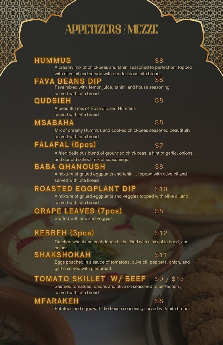 The menu highlights include fresh and vibrant salads like Tabbouleh and Tahini Salad, each starting at just $8.00, offering a refreshing take on traditional favorites. The soups, particularly the Lentil Soup, are comforting and flavorful, priced at $8.00, perfect for any season.